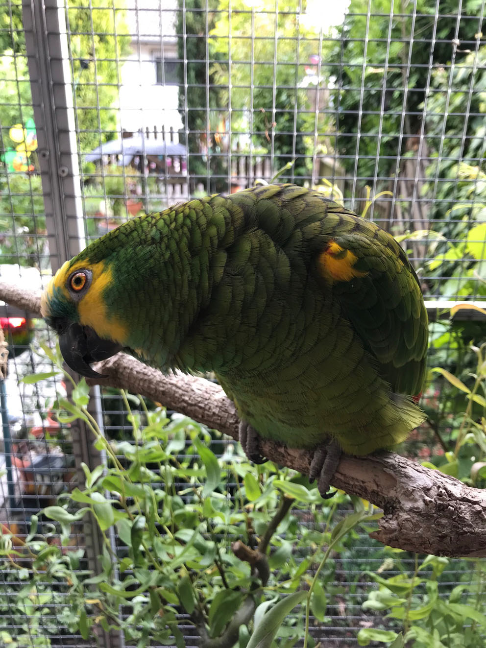 Anfang Mai gab es für die Innenvoliere mal wieder neue Stangen, die Maxi sofort bearbeiten musste. Ansonsten ist sie immer noch sehr gluckig, es nimmt kein Ende. Wenn sie Kork schreddert und einige Krümel dann unten liegen, klettert sie runter und bleibt dort sitzen, wobei sie dann auch einige Krümel um sich wirft. |