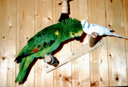 Zu jener Zeit hatten wir noch einen Wellensittich mit dem Namen "Bubi". Die beiden haben friedlich zusammengelebt. Coco war ja noch ein Baby und der kleine Sittich hat die Dicke wie sein eigenes Baby gefüttert. Das sah immer furchterregend aus, wenn der kleine Kerl seinen Kopf in den riesigen Schnabel steckte. (Video, Dez.91)