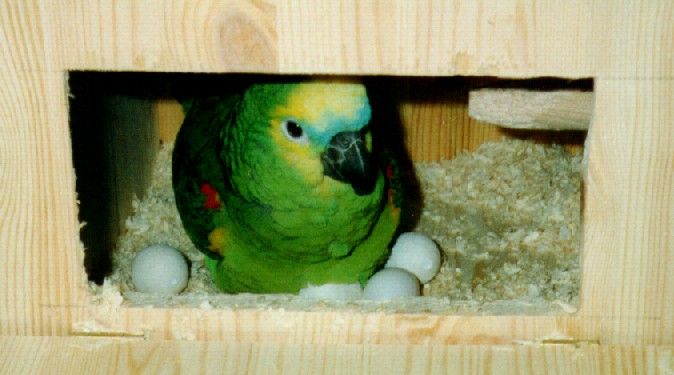 Dass Coco ein Weibchen ist, wissen wir nur deshalb, weil sie einmal Eier gelegt hat und zwar im Mai 1996. Angefangen hat es damit, das Coco schon immer gern in offene Schränke oder Schubladen kletterte. Frank hat dann für sie zum Spielen eine Art Nistkasten gebaut, den wir oben auf unseren Schrank stellten.