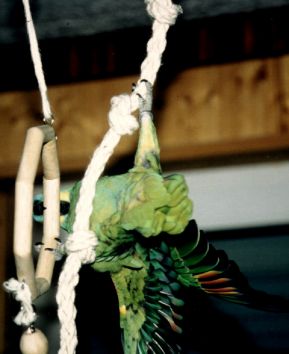 Als Coco noch "jung" war, hat sie auch gern geschaukelt, kopfüber an einer Kralle hängend, dabei kreischend, mit den Flügeln schlagend und immer schneller drehend! Das ist vorbei. Sie mag es nicht mehr. Ich weiß auch nicht warum. Wenn ich sie auf Max' Baumwollschaukelring setzen will, weigert sie sich. Setzt sie sich dann doch mal drauf, fängt sie an zu zittern und fliegt weg.
