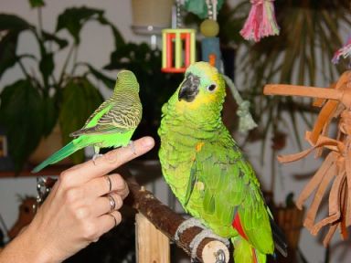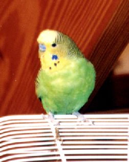 Im Herbst 1998 ist uns ein Wellensittich zugeflogen. Ein ganz lieber, zutraulicher Kerl, der sofort auf den hingehaltenen Finger sprang. Wir dachten eigentlich, dass so ein anhänglicher Vogel doch bestimmt irgendwo vermisst wird. Aber das war nicht der Fall. Niemand hat ihn vermisst. Also blieb er erst mal bei uns. Coco flog sofort auf den Kleinen zu, der wiederum überhaupt keine Angst vor ihr hatte. Der Kleine pickte an Coco's Schnabel herum und Coco ließ alles mit sich geschehen! Ob sie dabei Erinnerungen an ihre Babyzeit hatte und an den alten "Bubi" dachte??? |