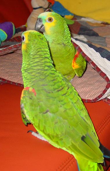 Die Brutzeit hat auch schon wieder angefangen. Wie immer ist Coco schmusig und Maxi aggressiv. Maxi hat mal wieder beschlossen, dass das halbe Wohnzimmer nun IHR Eigentum ist. Sobald Frank irgendwas in ihrem Revier macht, sei es eine CD/DVD aus dem Regal zu nehmen oder den kleinen Schrank zu öffnen, um ein Glas zu holen, fliegt sie ihn über den Kopf oder greift auch direkt an.