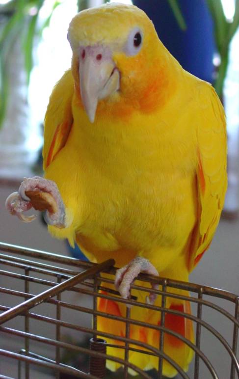 Die Brutzeit verlief dieses Jahr "normal", also ohne Eierlegerei! Die Beiden haben zwar verstärkt nach Höhlen und Verstecken gesucht, aber ich hab höllisch aufgepasst. Nur einmal nicht ... Maxi kletterte hinter den Fernseher und nagte ein schwarzes Kabel an, was nun "golden glänzt". Sie hat also die Ummantelung abgeknabbert. Zum Glück ist nichts weiter passiert. Von da an wollten aber beide immer wieder hinter den Fernseher, wir haben dann rechts und links Kissen dazwischengeklemmt und trotzdem flogen oder gingen sie immer wieder hin. |